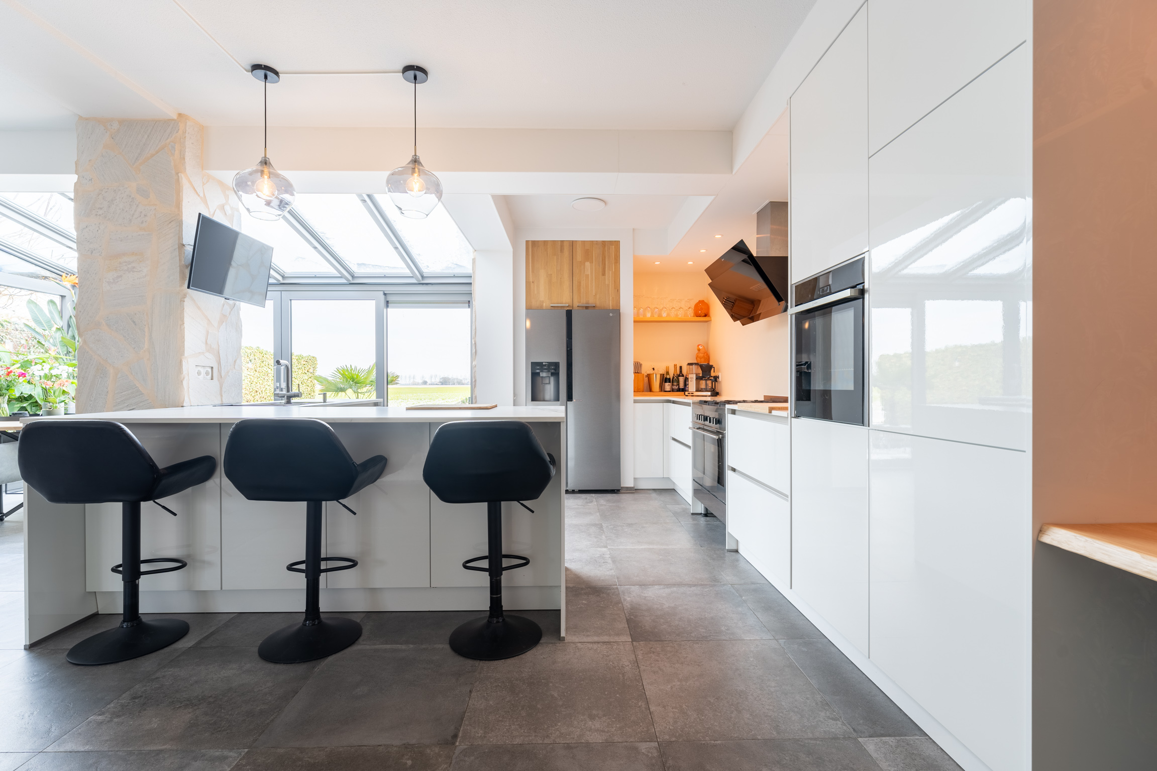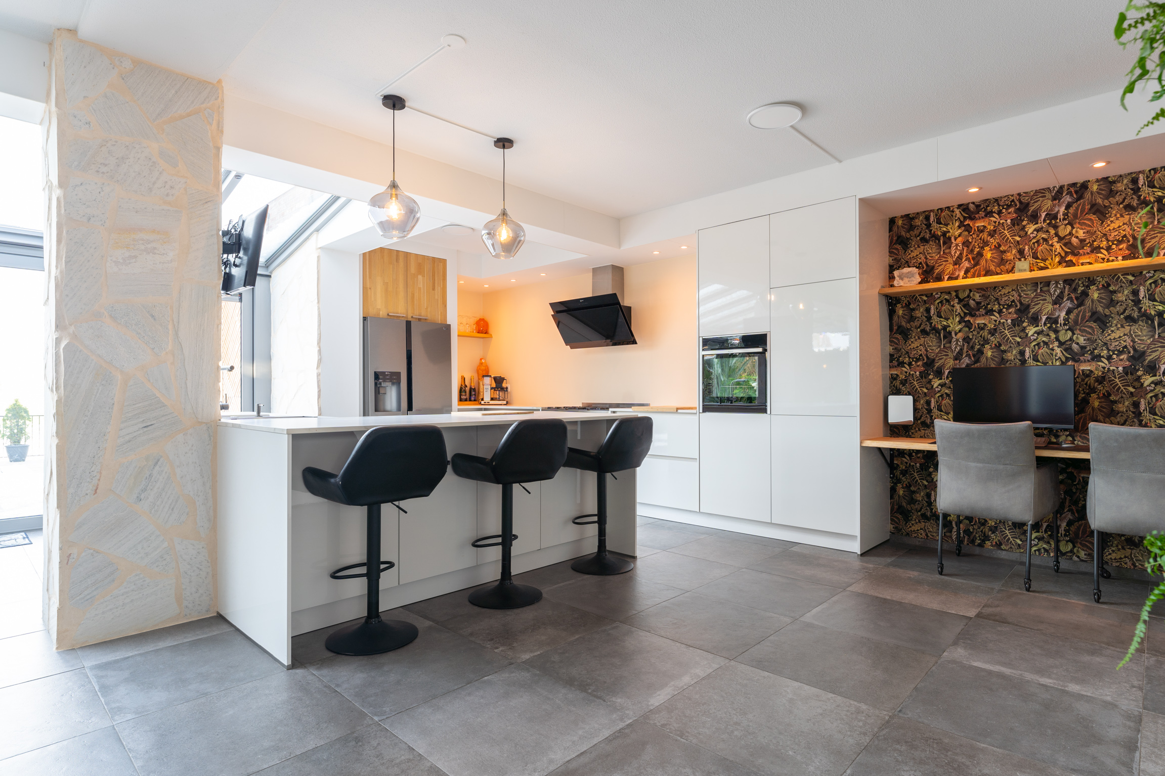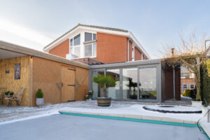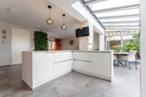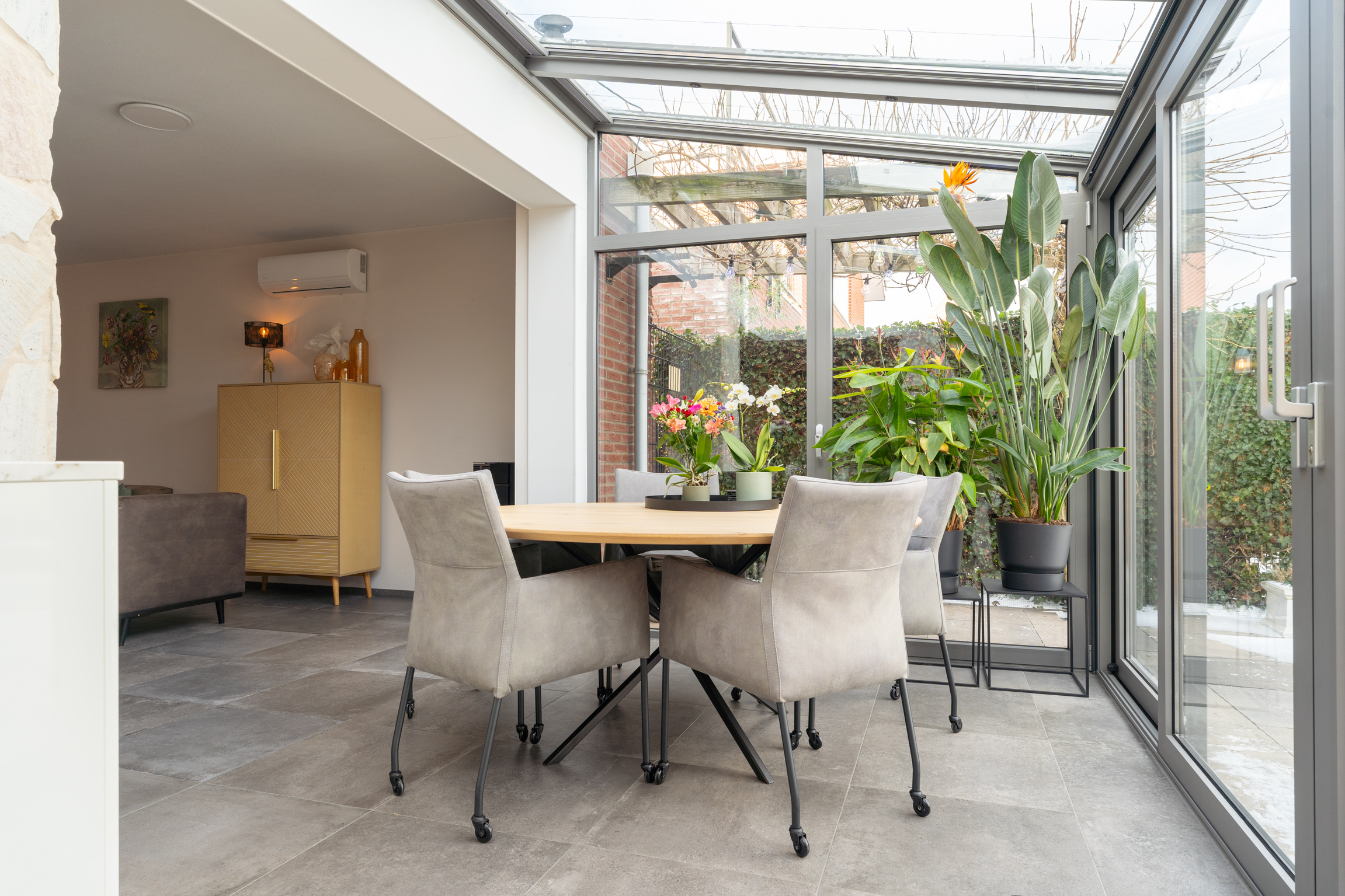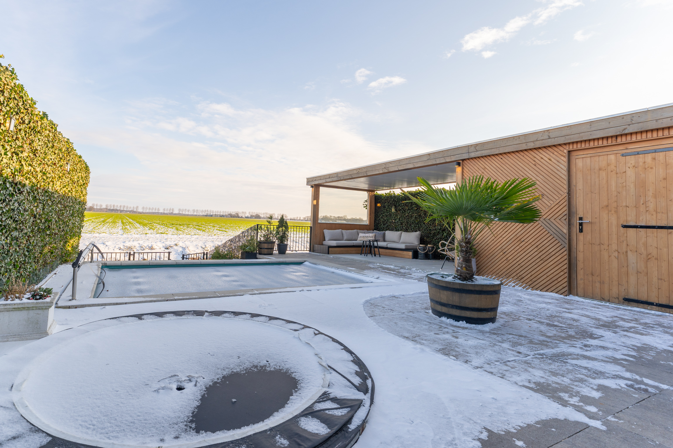 De moderne keukenopstelling is dicht bij de serre geplaatst waarvoor er veel daglicht is. Vanuit de serre loop je eenvoudig de ruime tuin in, met een heerlijk verwarmd zwembad. In de tuin staat ook een berging en moderne overkapping. Ook hier kun je volop genieten van het fraaie uitzicht.