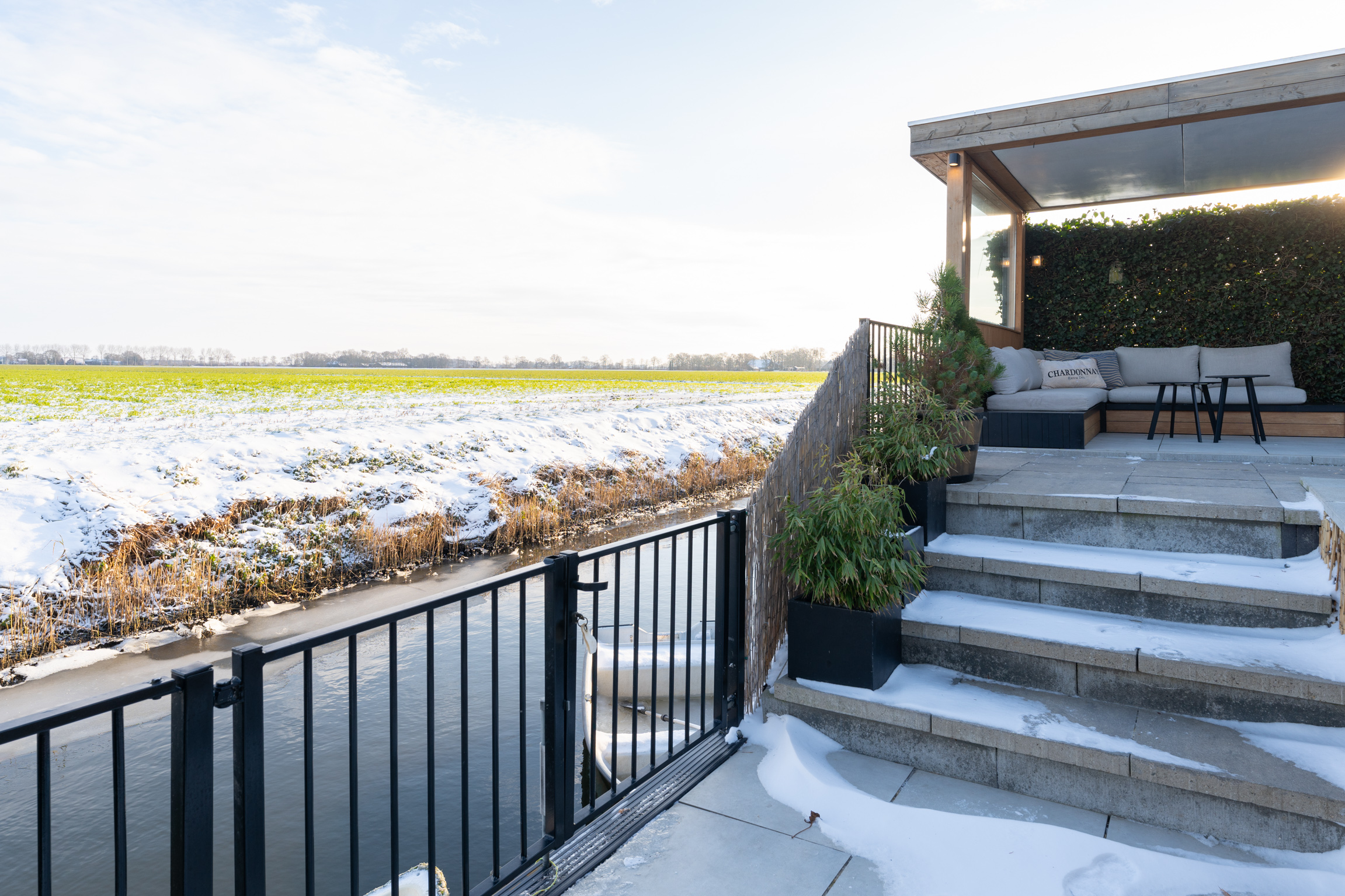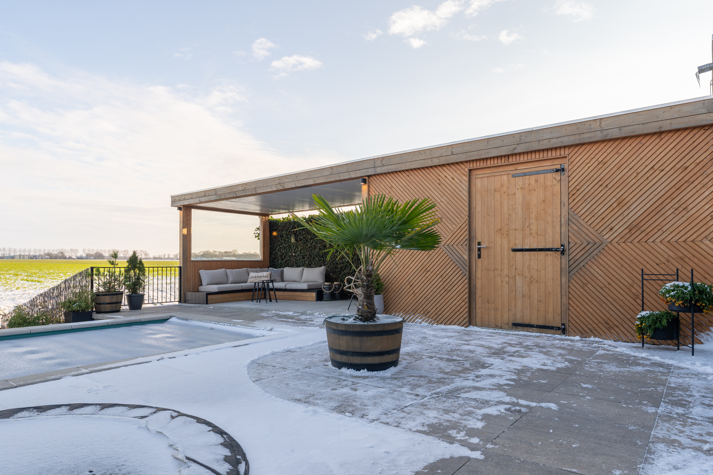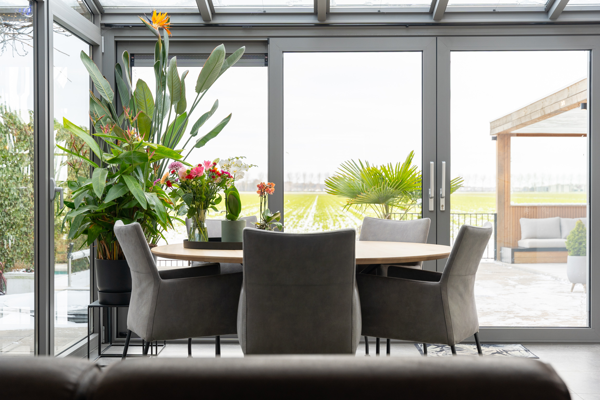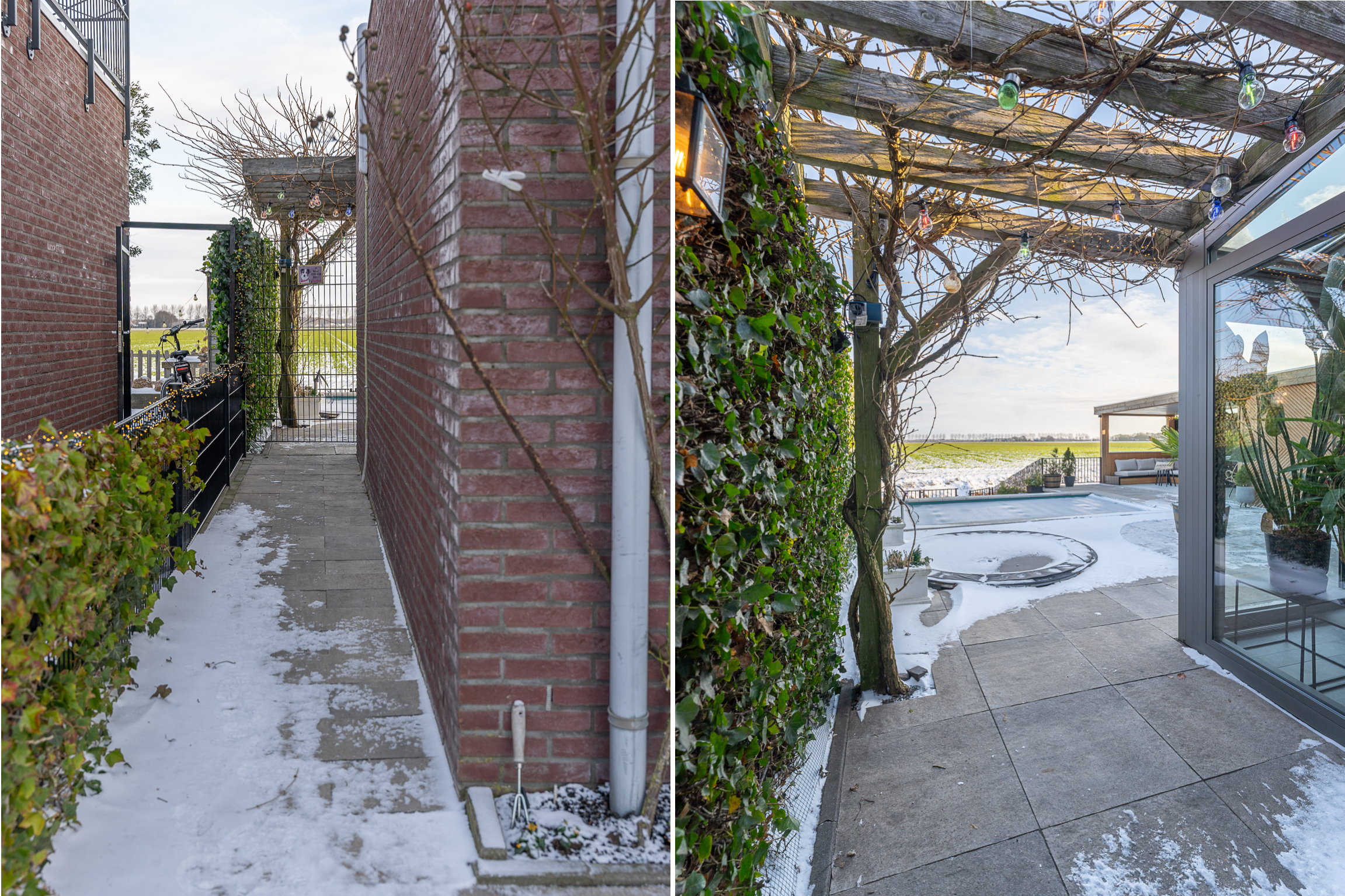De moderne keukenopstelling is dicht bij de serre geplaatst waarvoor er veel daglicht is. Vanuit de serre loop je eenvoudig de ruime tuin in, met een heerlijk verwarmd zwembad. In de tuin staat ook een berging en moderne overkapping. Ook hier kun je volop genieten van het fraaie uitzicht.