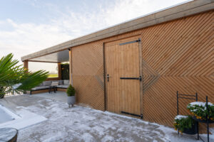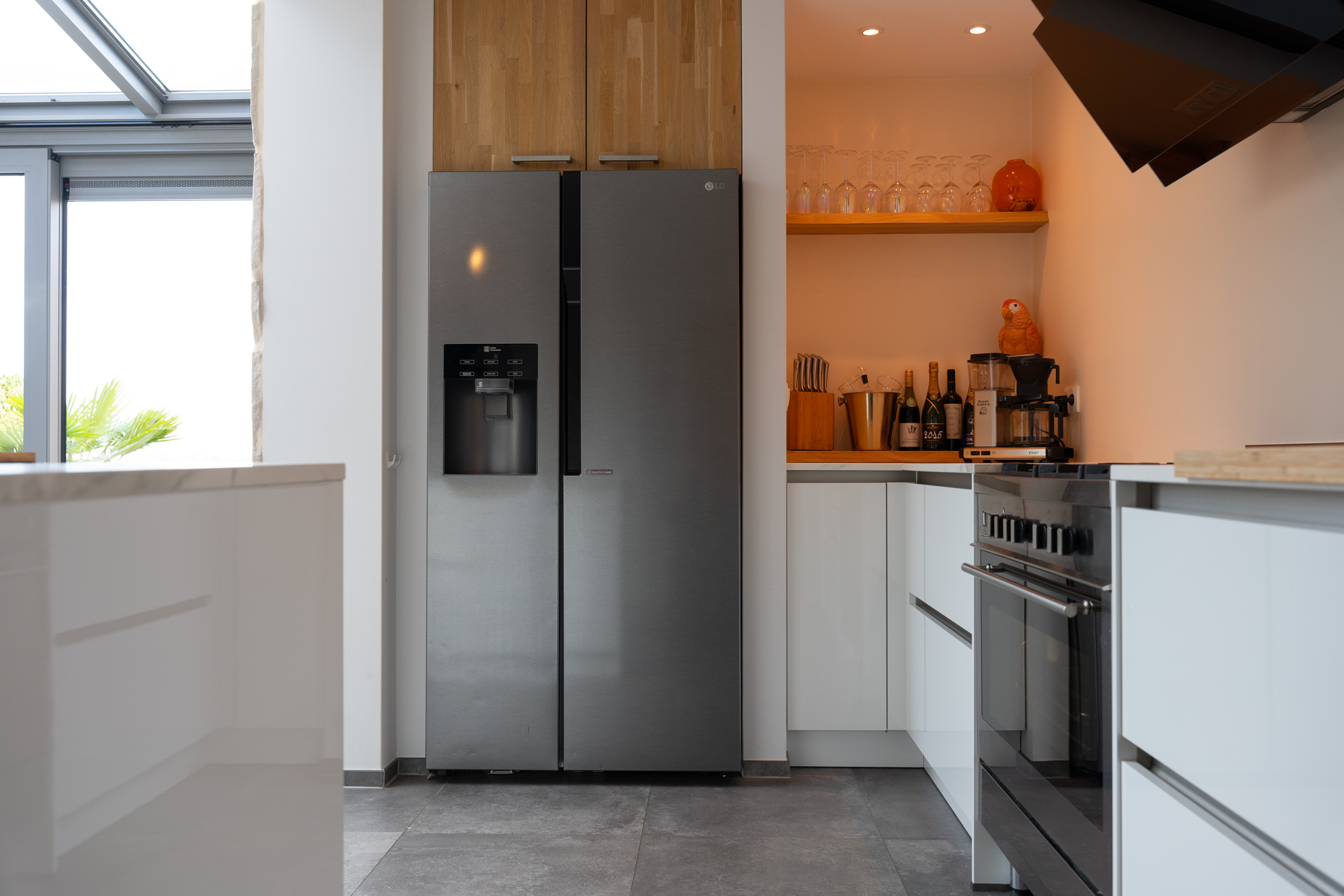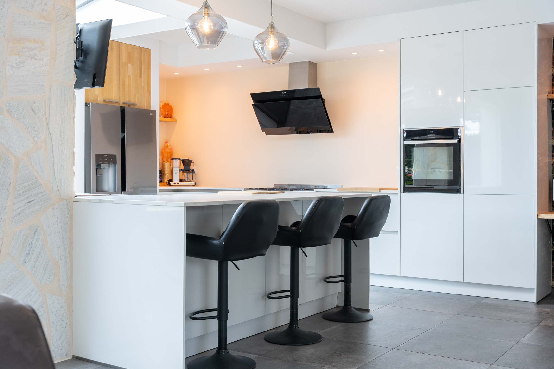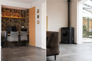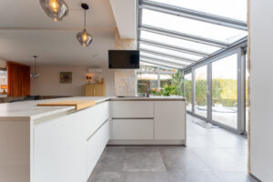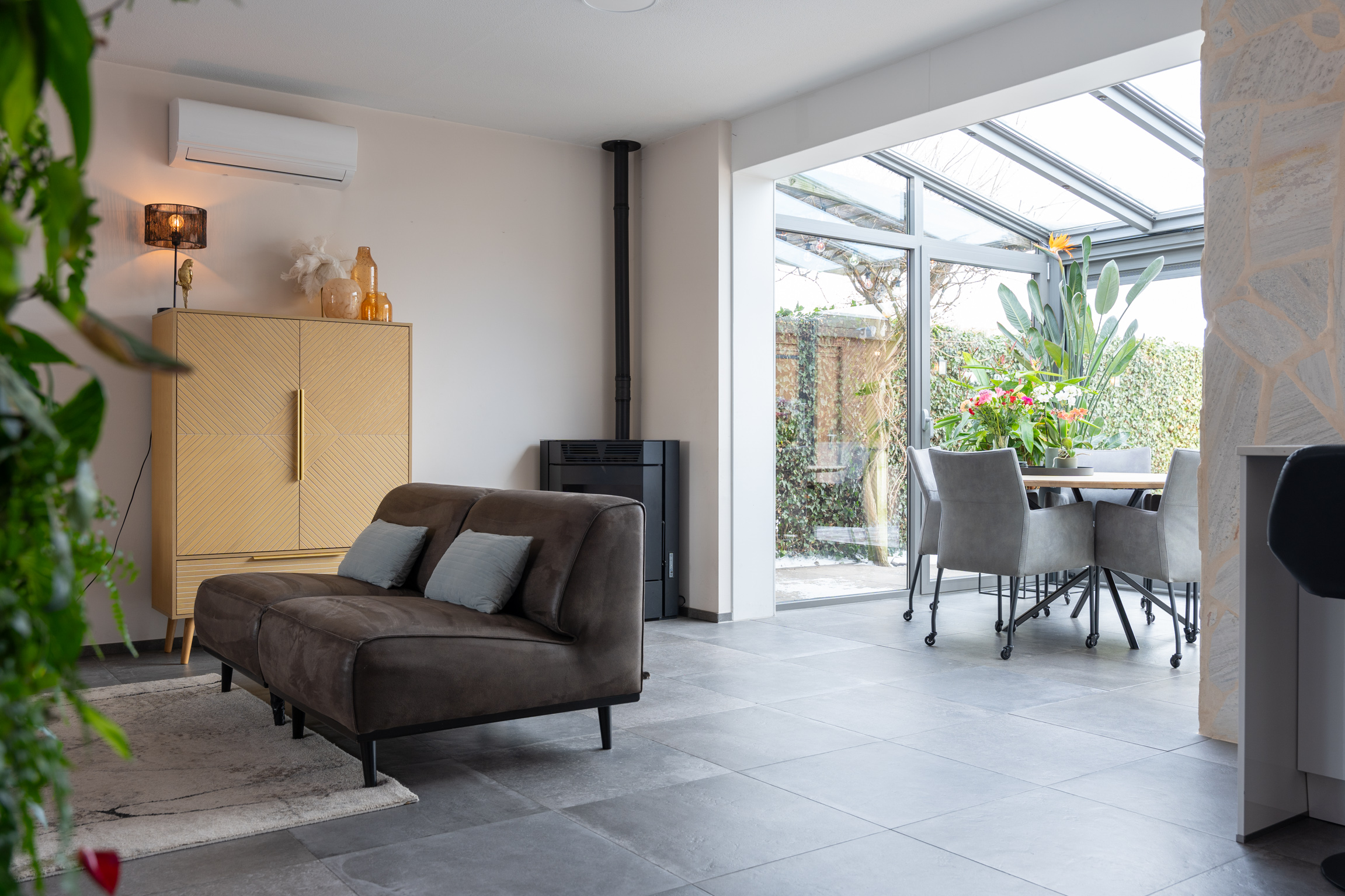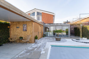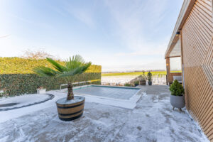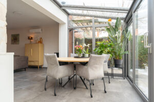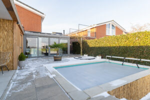 De moderne keukenopstelling is dicht bij de serre geplaatst waarvoor er veel daglicht is. Vanuit de serre loop je eenvoudig de ruime tuin in, met een heerlijk verwarmd zwembad. In de tuin staat ook een berging en moderne overkapping. Ook hier kun je volop genieten van het fraaie uitzicht.