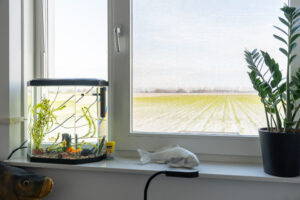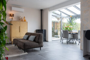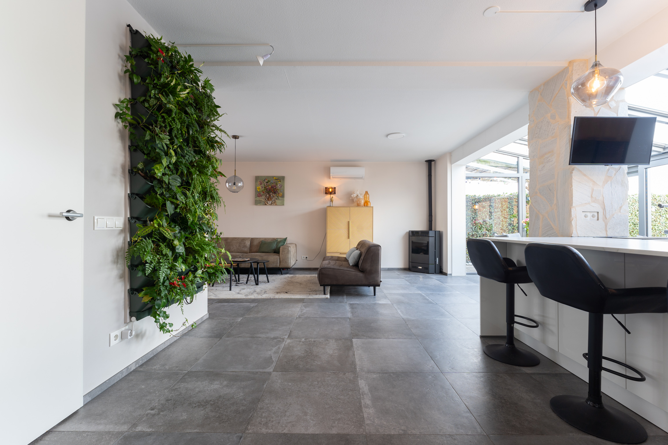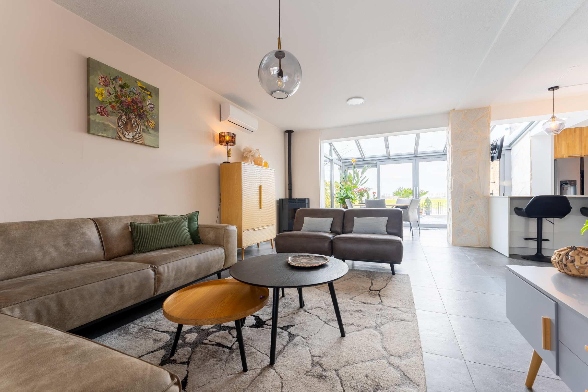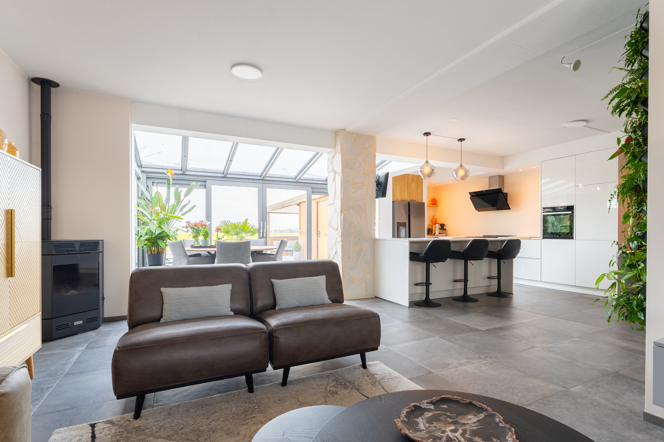 Via de entree kom je in de ruime hal met toegang tot de slaapkamer, badkamer, toilet en de woonkamer met open keuken en serre. Bij binnenkomst van de woonkamer en keuken valt direct de prachtig lichte serre op. Dankzij de serre is er volop daglicht en een schitterend uitzicht over het polderlandschap.